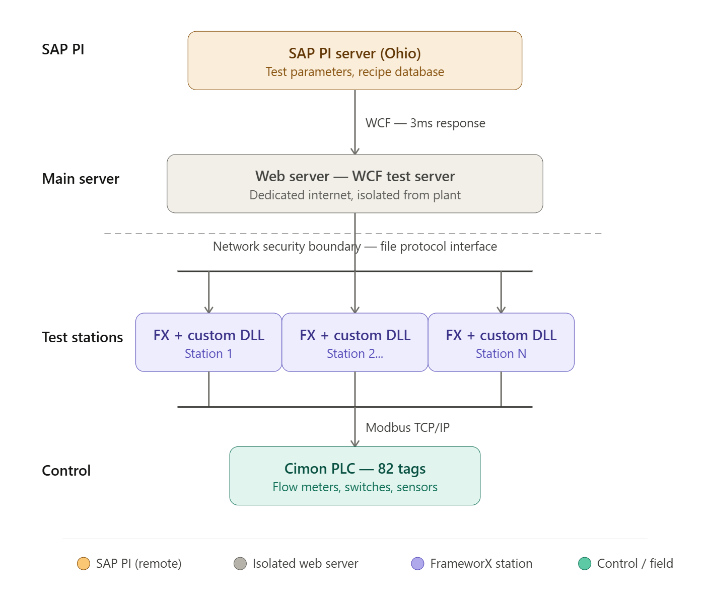 Challenge: Engineer a new boiler test station solution that retrieves test parameters from a remote SAP PI system (Ohio) while maintaining network security and high-accuracy flow measurement.