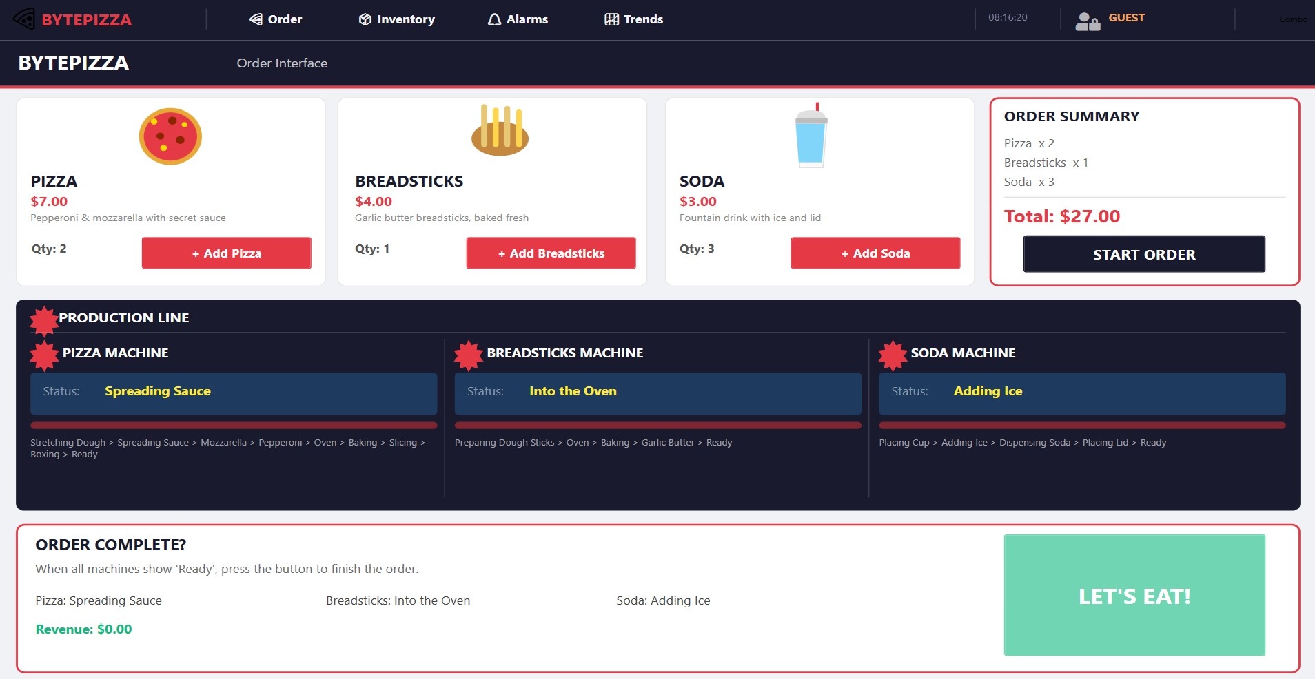 OrderInterface | Canvas | Full order workflow: menu cards (Pizza $7, Breadsticks $4, Soda $3), order summary, production line status with real-time machine states, and "Let's Eat" completion button |