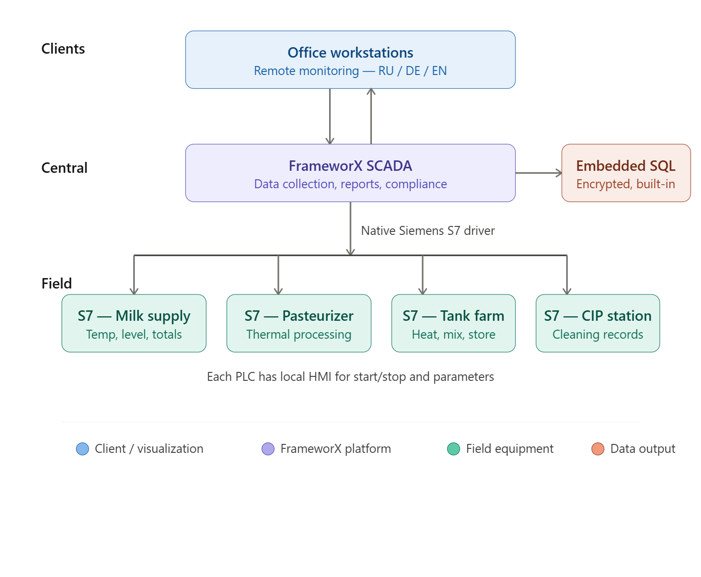 | Central | FrameworX SCADA | Plant-wide data collection, reports |