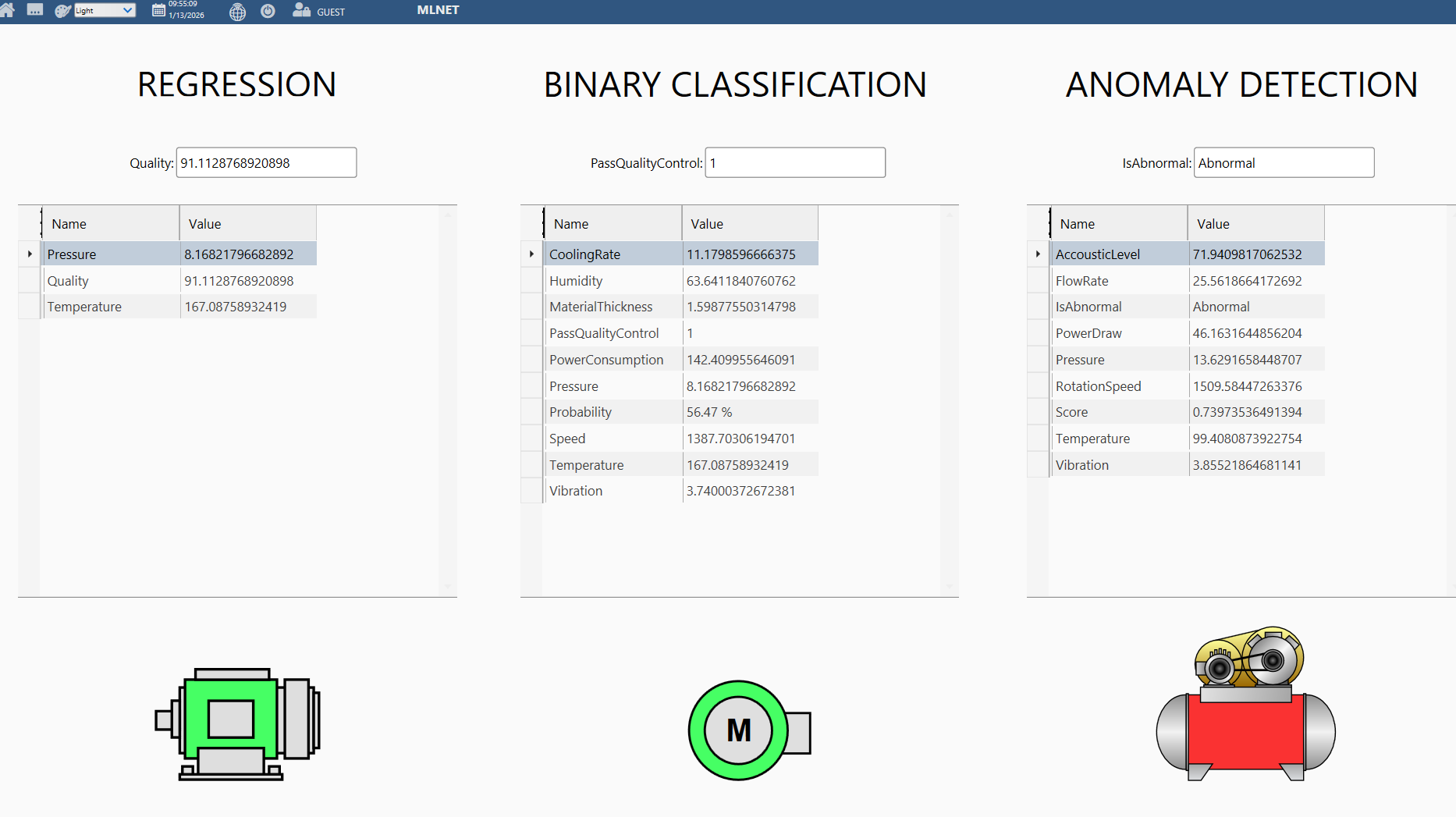 On the main page in Displays / Draw, you can see three tables displaying the outputs of each machine learning model, along with motor symbols below them to indicate whether the model output is considered good (green) or not (red).