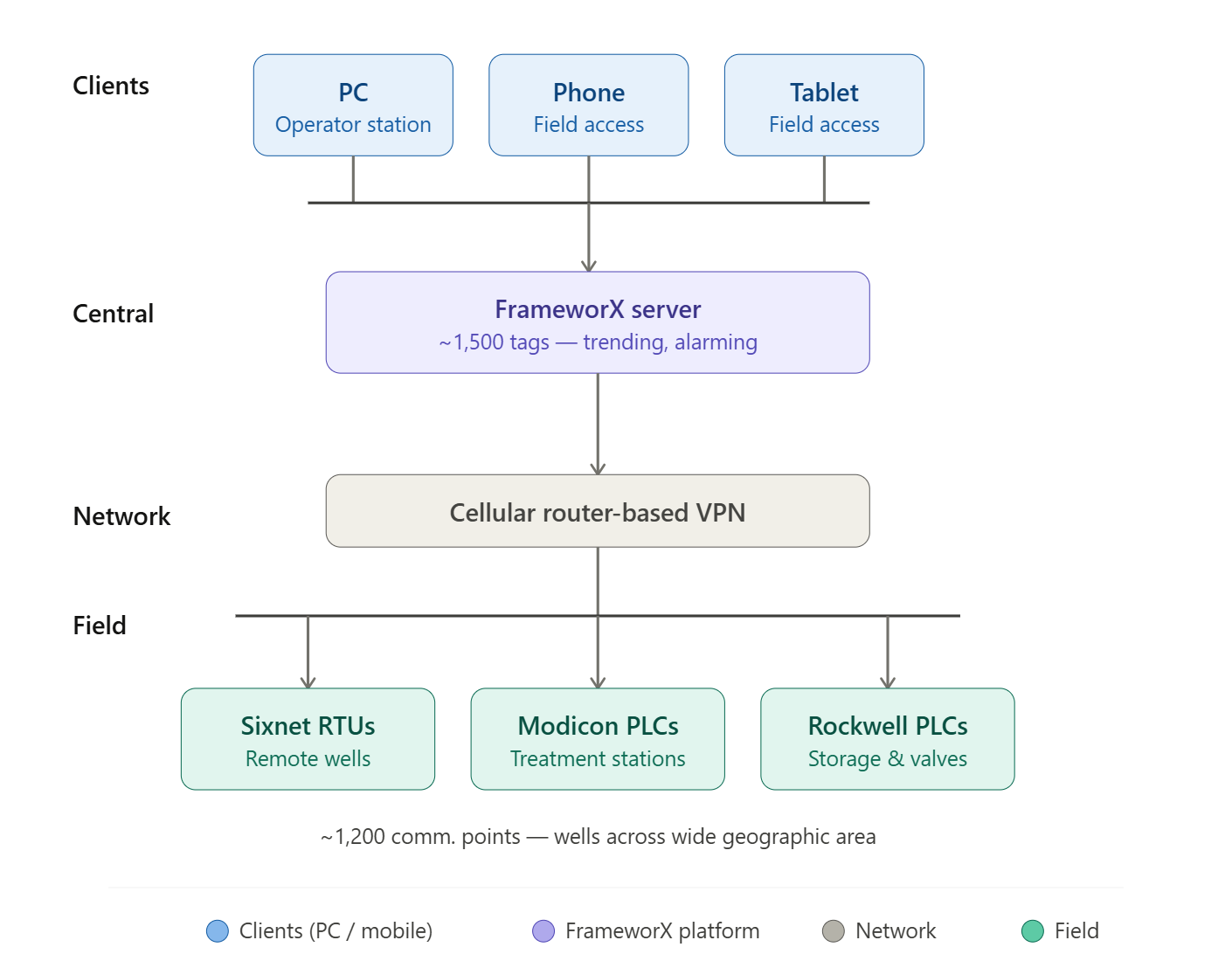| Field | Sixnet RTUs, Modicon PLCs, Rockwell PLCs | Remote well stations |