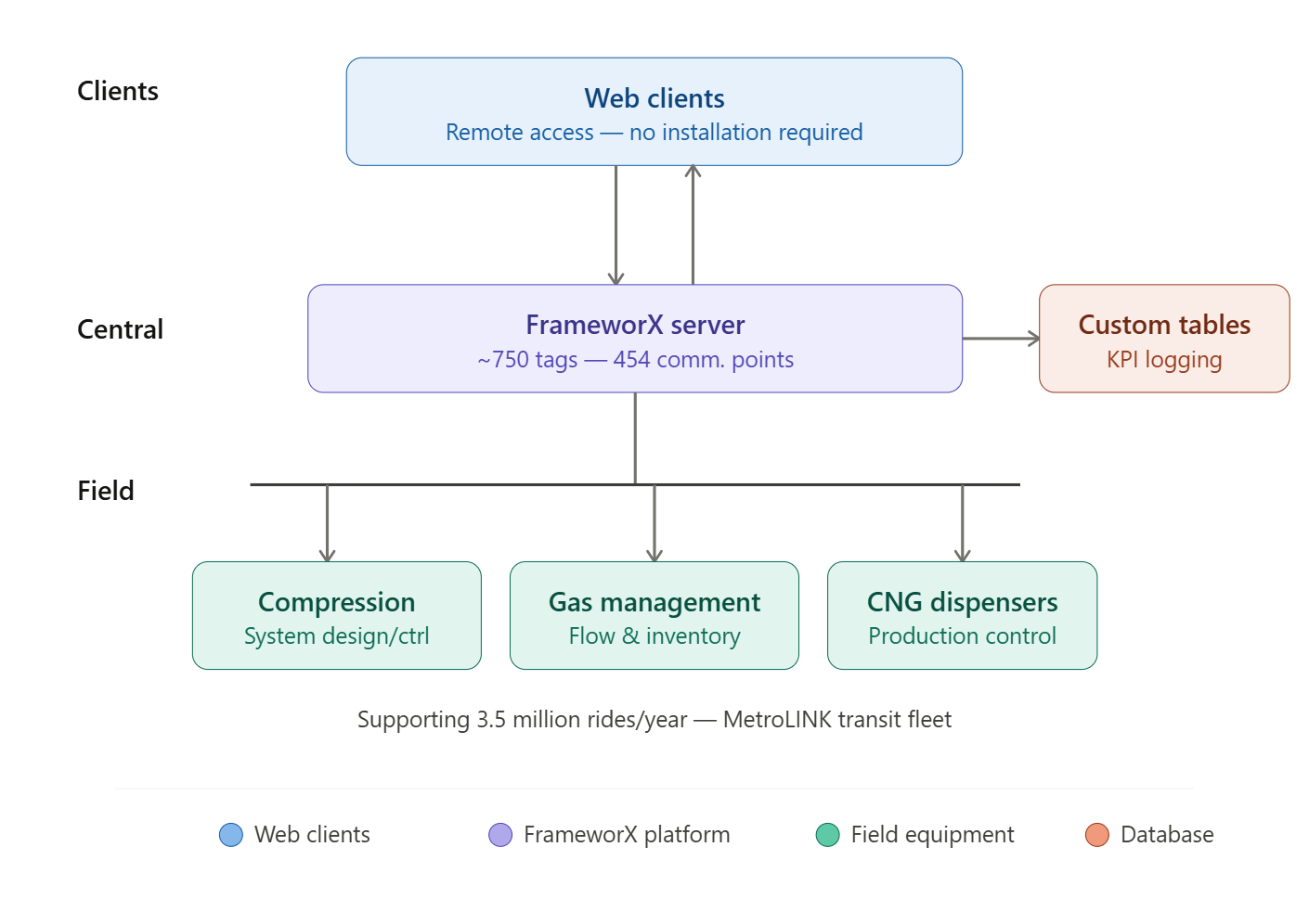 Challenge: Monitor and control Compressed Natural Gas (CNG) refueling equipment to support MetroLINK's fleet of alternative fuel buses, including compression systems, gas management, and dispenser production.
